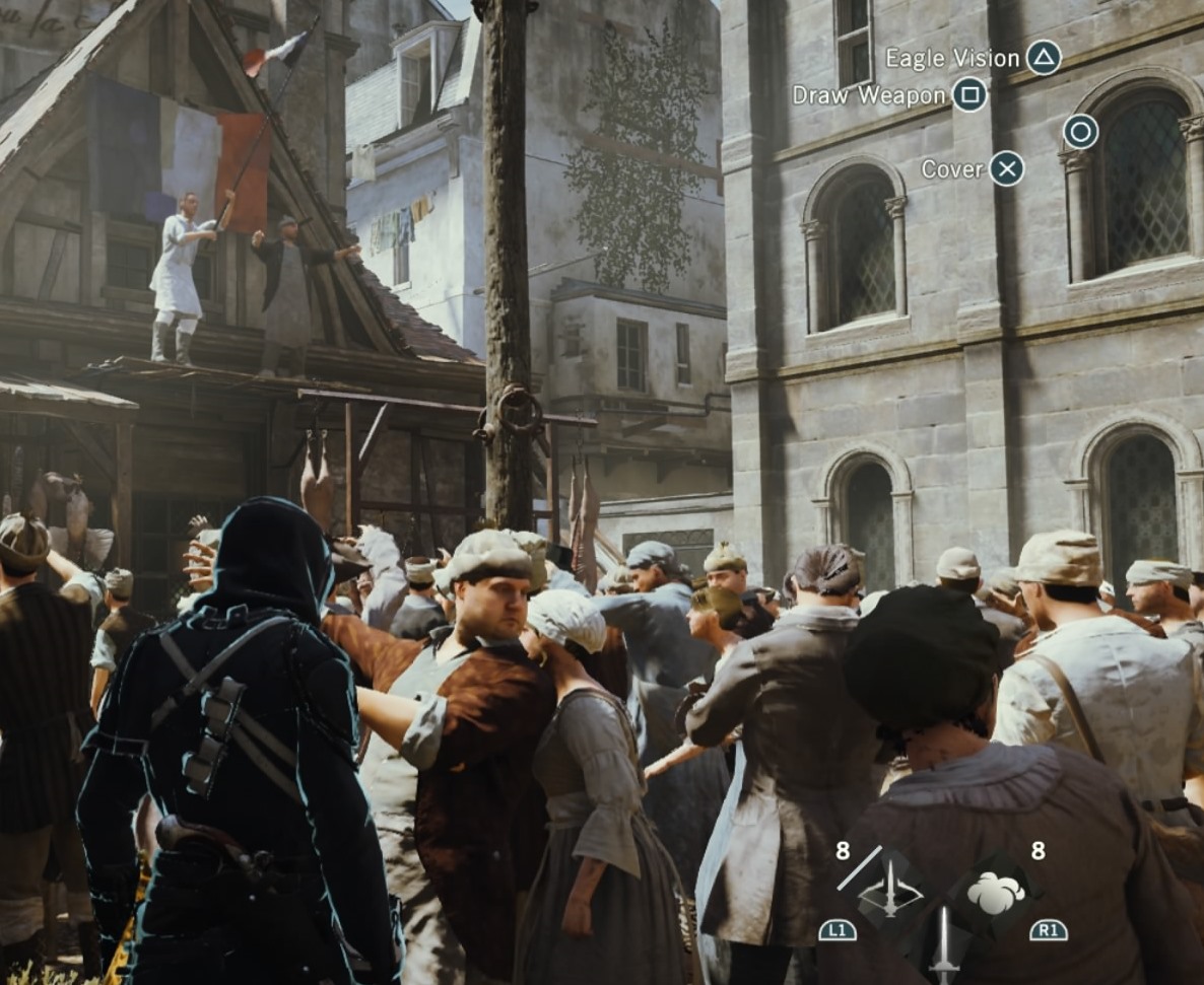 Aino Harvolan AC: Black Flag -arvostelussaan manaamat varjostus- ja salakuuntelutehtävät olivat Unityssa vähäisiä. Itse en manannut Unityssa juuri mitään, paitsi aikarajoitteista takaa-ajoa, kuten jo mainitsinkin. Suosikkitehtävikseni nousivat lukkojen tiirikoinnin jälkeen soluttautumistehtävät, joissa kaikessa rauhassa tutkiskeltiin suurta linnoitusta ja koetettiin päästä huomaamatta eteenpäin. Pidin myös katoilla väijyskelystä ja vihollisten hoitelemisesta salavihkaa tappavilla tai berserkkiraivoon ajavilla nuolilla. Toisaalta kyllä vähemmän salavihkaisetkin hommat Arnolta sujuvat, iskin savupommia maahan ja tapoin sen suojissa niin monta vihollista kuin ehdin. (Hienostuneemmat taistelutavat kuin ”attack”-napin hakkaaminen eivät koskaan onnistuneet minulta. Ehkä ensi pelissä.)