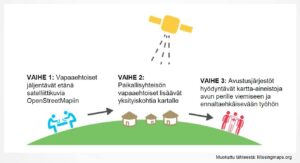 Vaihe 3: Avustusjärjestöt hyödyntävät kartta-aineistoja avun perille viemiseen ja ennaltaehkäisevään työhön.